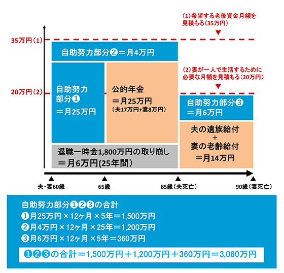 下図は、60歳で退職、65歳から公的年金を受け取るケースで、夫婦2人くらしの場合の老後生活に必要な月額を35万円(夫死亡後は20万円)とした場合の例です