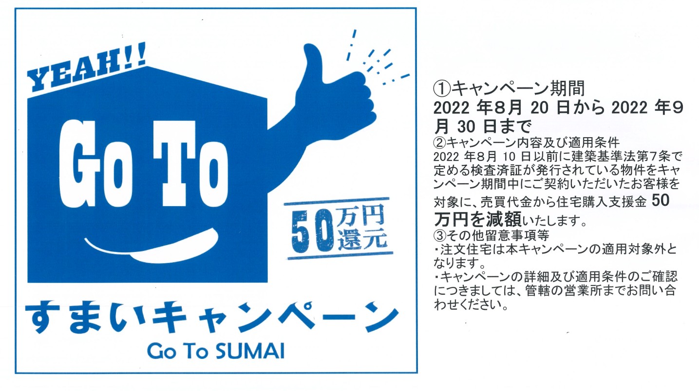 内容: 2022/8/10以前に、建築基準法第7条で定める検査済証が発行されている物件をキャンペーン期間中にご契約頂いたお客様に 購入支援金50万円を減額致します。